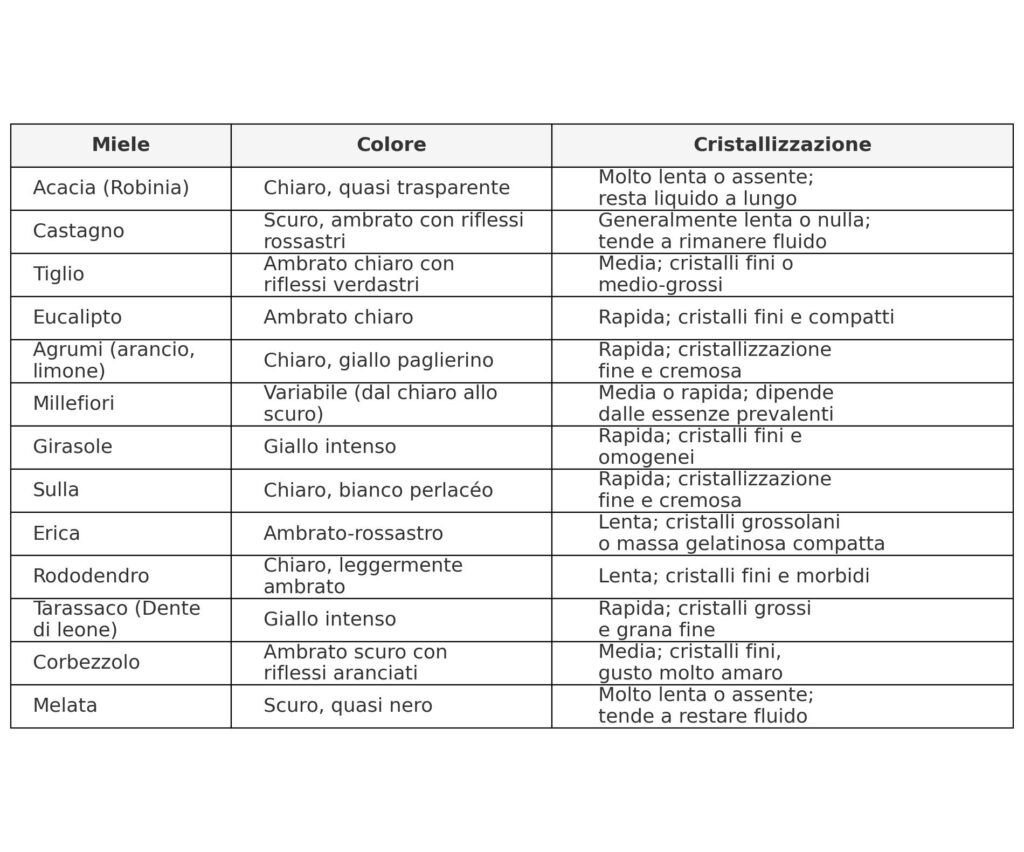 Nella tabella sottostante alcuni tipi di cristallizzazione dei comuni mieli: